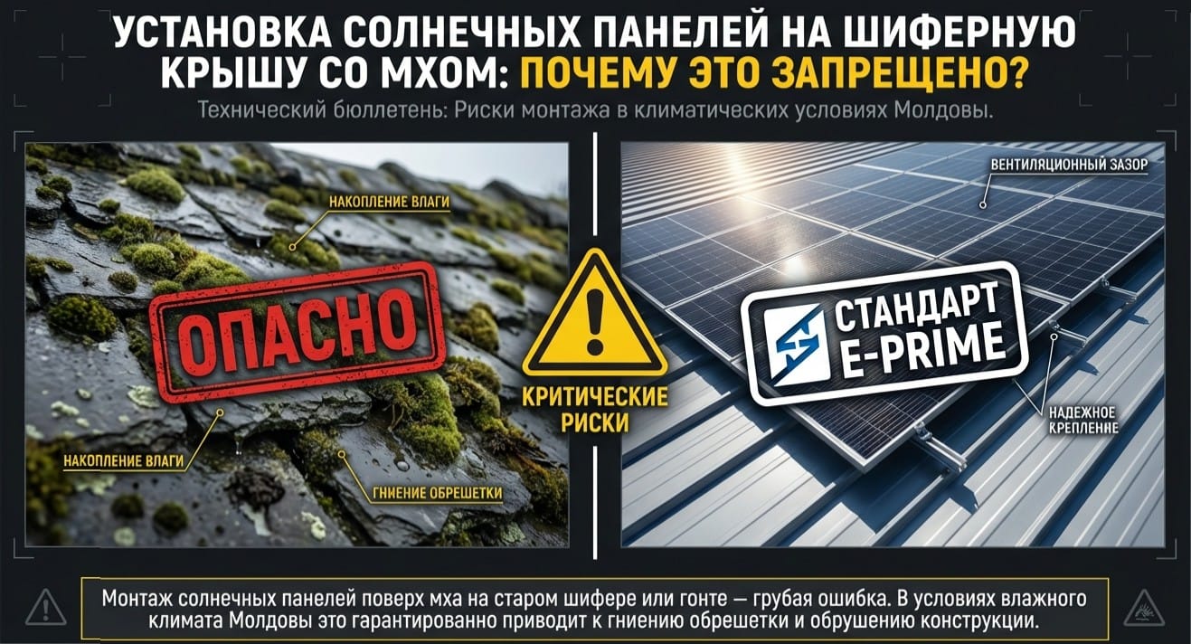 Montajul panourilor solare peste mușchi pe ardezia veche (șifer) sau șindrilă — este o greșeală gravă, care duce la putrezirea asterelei. În condițiile climatului umed al Moldovei (cețuri) sub profil se creează o „seră”, care distruge acoperișul în 2 ani. Este necesară curățarea prealabilă cu un aparat cu jet de apă.