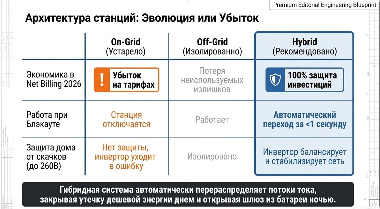 Conform „Adevărului Ingineresc” E-Prime, instalarea unui sistem On-grid fără acumulatori transformă astăzi stația într-o „bombă cu ceas” pentru portofel. În regimul Net Billing, livrezi energia în rețeaua Premier Energy pe un preț de nimic în timpul zilei și o răscumperi de două ori mai scump seara. Un Sistem fotovoltaic hibrid cu invertor Deye sau Huawei rezolvă această problemă, redistribuind automat fluxurile de curent.