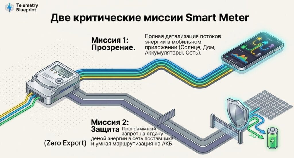 Instalarea unui Smart Meter rezolvă două sarcini critice. În primul rând, asigură siguranța și funcționarea corectă a bateriilor: invertorul înțelege clar când trebuie să direcționeze energia solară pentru încărcarea bateriei și când — către prizele din casă (de exemplu, pe Grid Load sau Backup Load). În al doilea rând, acesta permite activarea funcției de „export zero” (Zero Export). Dacă nu ați primit încă Aviz de racordare sau pur și simplu nu doriți să vindeți surplusul către Premier Energy la prețul mic de 2,50 lei, pentru ca seara să îl răscumpărați cu 4 lei, Smart Meter va opri automat generarea panourilor exact la nivelul pe care casa dumneavoastră îl consumă în acea secundă.